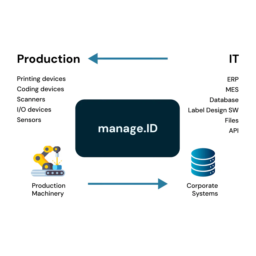 Manage.ID brings IT and production together, making sure the right data gets to the right devices exactly when it’s needed. It pulls data from customer’s IT systems, like ERP/MES or other databases, bundles it up, and sends it out to all your product identification devices.